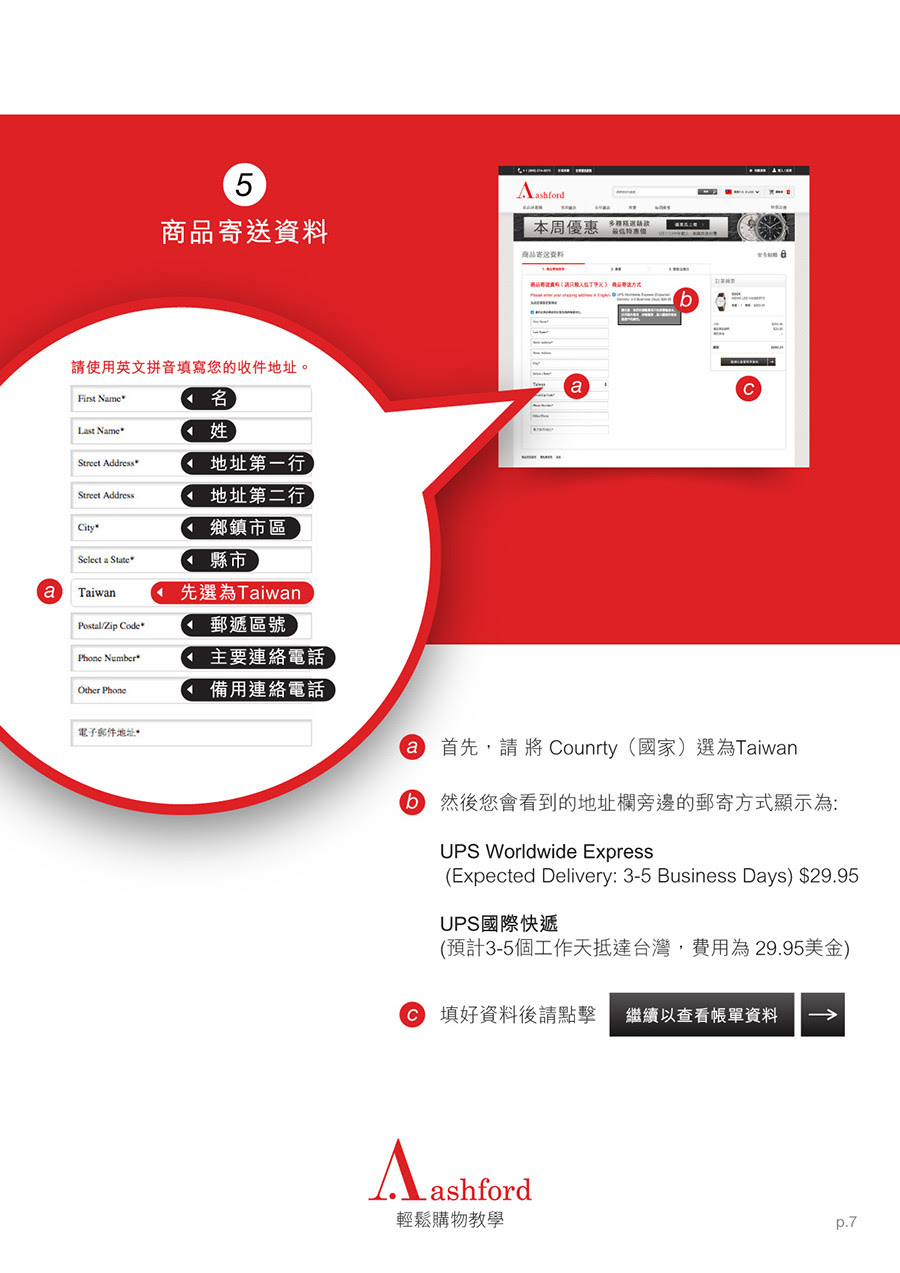 客戶可以使用VISA、Master、AE等信用卡付款,十分方便。此外,Ashford還提供台灣客戶專屬的0800免付費中文客服務電話0800-818-606。